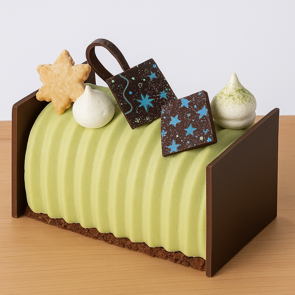 Mousse chocolat au lait 45% Cameroun (subtiles saveurs de fruits rouges et de châtaigne, avec des notes biscuitées), crémeux pistachr sur un brownie chocolat mi-amer. (Farine et noix)